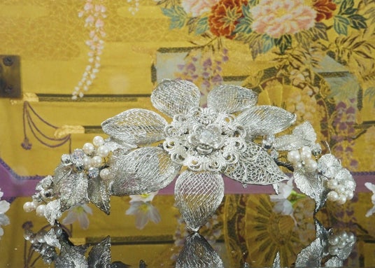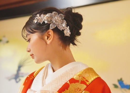 明治記念館の自然と格式、そして花嫁の“花”をイメージして制作されたオリジナルの髪飾りは、四季折々の花々を、三層に重ねた大輪の花モチーフが特徴。花弁は職人の手作業により金属糸で編み上げられ、繊細かつ軽やかな構造を実現。アンティーク調の葉には、天然真珠と宝飾硝子インフィオーラが散りばめられ、「365日の幸福が咲く人生」を象徴するアイテムとなっています。