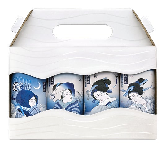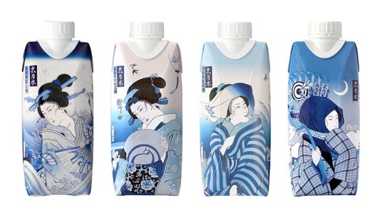 新商品「京乃水シリーズ 4本セット」は、1200年にわたり京都文化を支えてきた地下の名水を無菌充填したミネラルウォーター4本セットです。環境に優しい紙容器を採用し、新たな浮世絵表現の画家・絵師として活躍する石川真澄氏とのコラボレーションデザイン第一弾から第四弾を一つにまとめました。