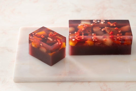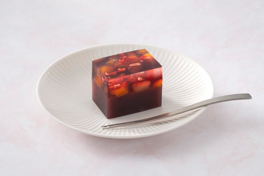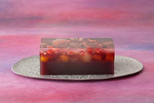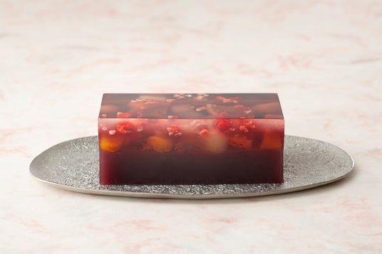 透明な琥珀羹と赤ワイン入りの琥珀羹を重ねることで、お菓子の断面にはワインカラーの鮮やかなグラデーションが。つるんとしたなめらかな食感とともに、目でも口でもお楽しみいただける一品となっております。