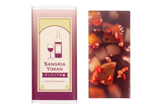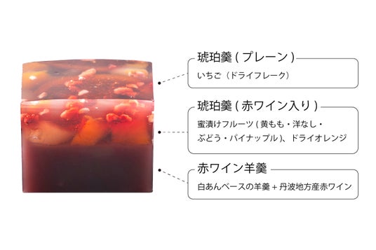 フルーツがごろごろと入ったサングリアをイメージして、京都・丹波地方産赤ワイン入りの白あん羊羹・赤ワイン入りの琥珀羹(こはくかん)・透明な琥珀羹の三層を、和菓子職人の手作業でていねいに重ね、その間に蜜漬けのフルーツをたっぷりとお入れしました。