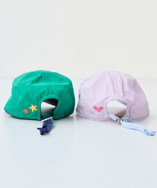 サイズ調整ができるタフタキャップのキッズタイプ。ママとリンクコーデができるキャップは、ハートや星がアクセントになった刺繍つき。成長の度合いによって帽子のサイズが変わる子どもたちに嬉しいドロスト付き。UV対策の機能が備わり、たくさん汗をかく夏もお家で洗えるのでお手入れも楽ちん!