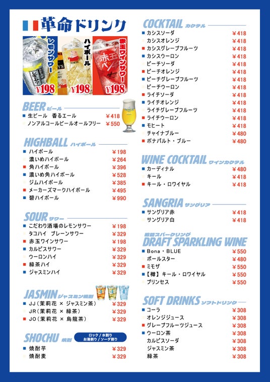 「ハイボール」「こだわり酒場のレモンサワー」「赤玉ワインサワー」が1杯198円(税込)!ボナパルト・ブルーは、ドリンクメニューも大変お得な価格設定のため、