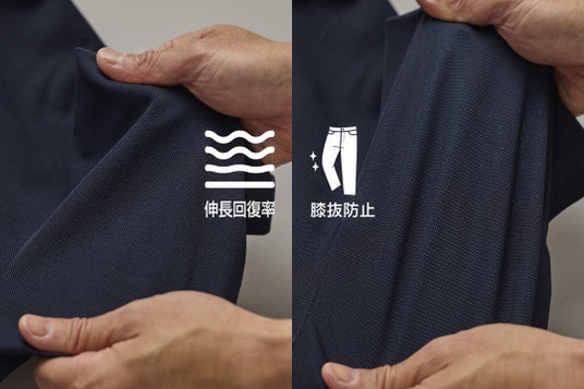 目の粗いメッシュを特殊技術で圧縮した、高密度で伸縮性に富んだ素材です。動きに合わせてしっかり戻るため、型崩れや膝抜けも防止します。