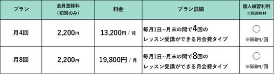 予約専用サイトより、ご希望のレッスン日時をご予約いただく完全予約制です。予約時間の1時間前までお客様ご自身で予約専用サイトからキャンセルが可能で、急な用事などが入ってしまった場合も1回分の費用を消化することなくキャンセル対応が可能で安心です。また、通いたいペースにあわせて、月4回、月8回のプランをお選びいただけます。月の利用回数を超えてご利用されたい場合は1回あたり3,850円をお支払いいただければ追加での受講が可能です。