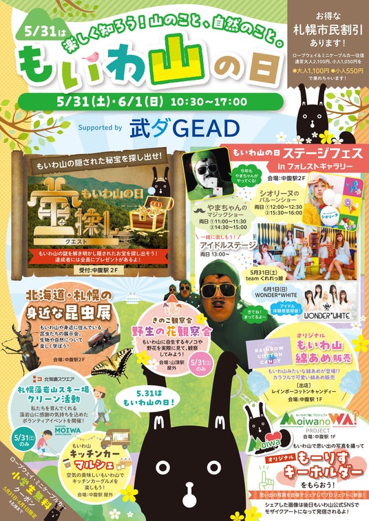 藻岩山標高531mにちなみ、毎年5月31日は「もいわ山の日」として、札幌市民や北海道民、そして観光客の皆さまに藻岩山の魅力を再発見していただく楽しいイベントを開催します。