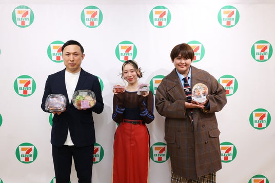 ※写真左から、株式会社セブン‐イレブン・ジャパン 商品本部 米飯・麺類部 シニアマーチャンダイザー 佐藤 達也、パパラピーズ・タナカガさん、パパラピーズ・じんじんさん