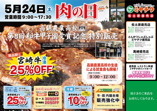株式会社ミヤチク(本社:宮崎県都城市/代表取締役社長:船ヶ山 祐二)が運営する「宮崎牛」「宮崎ブランドポーク」「ハム・ソーセージ」を取り扱う直売店(宮崎県内3店舗)にて、5/24(土)にお肉が割引価格でお買い求めいただける「肉の日」を開催します。さらに!佐土原直売店では、高鍋農業高校が第8回和牛甲子園において”取組評価部門”で優良賞、”枝肉評価部門”で審査委員特別賞を受賞したことを記念して、生徒による同甲子園出品牛の特別販売と試食会を同時開催いたします!