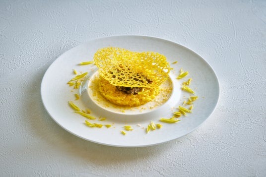 サフランのリゾットにポワレにしたリードヴォーをのせ、クリーミーな味わいに仕上げました。太陽に向かって力強く育つひまわりのようにデザインしております。