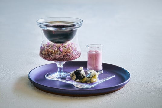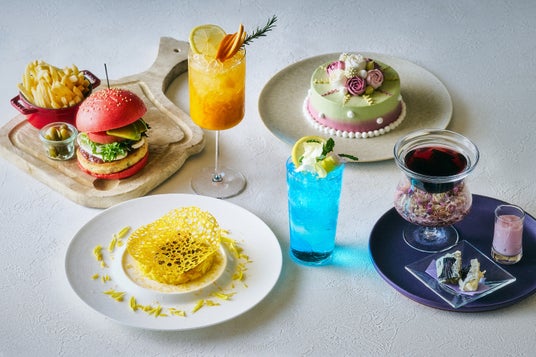 ビーツのバンズで焼き豆腐に大豆チーズや干し椎茸、オニオンやキャロット、インゲン、ひよこ豆で作るパティを挟んだ100%植物由来のバーガーや、抹茶やあずきなどにグリオットチェリーの甘酸っぱさを加えたグルテンフリーの緑のケーキ、力強く育つヒマワリをデザインした黄色いサフランリゾットのほか、和食では紫色の梅香るそうめん、バーでは水平線をイメージした青いカクテルやオレンジのフルーティーな味わいのノンアルコールカクテルなどシェフやパティシエ、バーデンダーが希望をテーマに考案したカラフルなメニューをお楽しみいただけます。