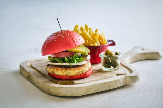 地上約180mに位置するAll-Day Dining OASIS GARDENでは、環境を考えた100%植物由来のメニューを拡充しております。チーズの代用に大豆由来の食材を使い、焼き豆腐をベースにオニオンやキャロット、インゲン、ひよこ豆、干し椎茸などを加えたパティをビーツのバンズで挟みました。