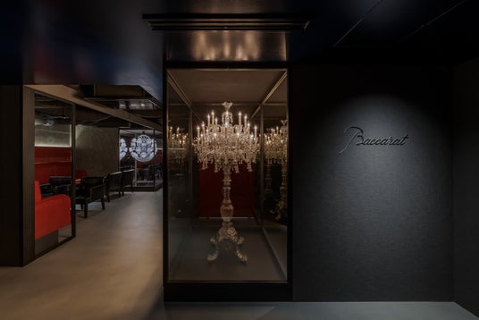 バカラを象徴する燭台「ツァリーヌ」やバカラグラスを「魅せるデザイン」としてレイアウトし、バカラのシャンデリアは様々な場所から視界に入るように2基レイアウト。更にそれらを囲むガラスの一部にはマジックミラーの仕掛けを施し、空間を視覚的に遮ることでエントランス側からの見え方と店内側からの見え方が全く異なる設計としています。この他、徹底してこだわったデザイン美学によって、エントランスエリアに足を踏み入れた瞬間にバカラの世界に包まれ、魅せられる演出を意図しています。