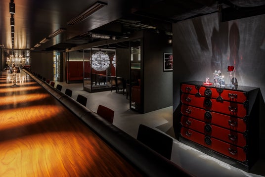 照度をギリギリまで絞った空間には、要所にメゾンを象徴する“赤”がアクセントカラーとして使用され、その洗練された世界観を表現しています。バカラグラスで埋め尽くされた「バカラの壁」に1つだけ配された赤いグラスやソファなどのインテリアにおいてこの“赤”は、ダークトーンを基調とした空間内で鮮烈かつ、情熱的な印象を与えています。また、モダンな空間の中に設置された格調高い岩谷堂箪笥、旧店舗から移設して使い続けている無垢材のバーカウンターの重厚な木目が、無機質な空間に絶妙な温かみを加えています。