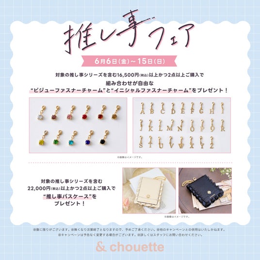 株式会社サマンサタバサジャパンリミテッド(代表取締役社長:古屋 幸二、所在地:東京都港区)は『& chouette(アンドシュエット)』より【2025 推し事フェア】を期間中、推し事フェアキャンペーンや一部店舗展開アイテムを販売。