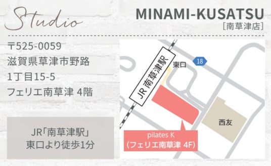 ピラティスK 南草津店は、滋賀県草津市の商業施設「フェリエ南草津」内にオープンする、女性専用のマシンピラティススタジオです。JR「南草津駅」東口から徒歩1分の好立地にあり、ショッピングや通勤・通学の合間に気軽に立ち寄ることができます。スタジオ内はカジュアルかつスタイリッシュな空間で、音楽に合わせたグループレッスンを楽しめます。お腹、お尻、二の腕、脚、背中など、部位別に特化したボディメイクプログラムが充実しており、強度や目的に合わせて選ぶことができます。まずは0円の体験レッスンから、お気軽にお試しください。