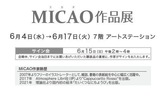 【神戸大丸 7階】『MICAO 作品展』待望の神戸開催でサイン会も 。ひと針ひと針に心を込めて。MICAOの刺繍で感じる爽やかな初夏の訪れ。6月4日(水)~6月17日(火)まで。原画&新作版画も登場。