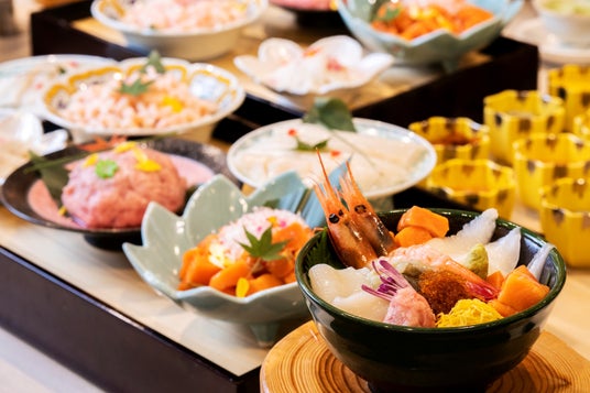 翌日のご朝食は花もみじ館のビュッフェをご用意。お好みの魚介をのせる花もみじ名物の勝手丼や出来立てのパンケーキなど、愉しさあふれる献立をお楽しみください。