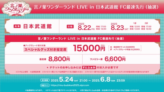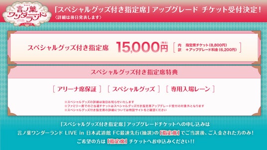 「スペシャルグッズ付き指定席」アップグレードチケットへの申し込みは言ノ葉ワンダーランド LIVE in 日本武道館 FC最速先行(抽選)の「指定席」でご当選後、ご入金された方のみ!