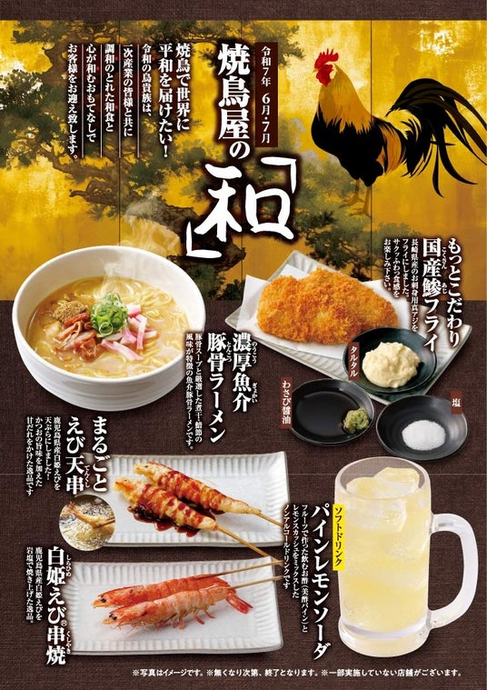 このような想いのもと、2024年8月より1年間を通じて期間限定メニュー『焼鳥屋の和』を展開してまいりました。第6弾となる今回で最後となりますが、これからも「焼鳥で世界に平和を届けたい」という想いのもと、おいしい料理と心からのおもてなしをお届けしてまいります。