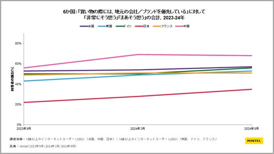ミンテルの行なった別の消費者調査によると、地元のブランドを優先する比率は2023年から上昇しており、「非常にそう思う」と「まあそう思う」の合計の比率で、主要国6か国中、日本を除く5か国で50%を超えています。日本でも数値は増加しており、2024年9月には35%に達しています。