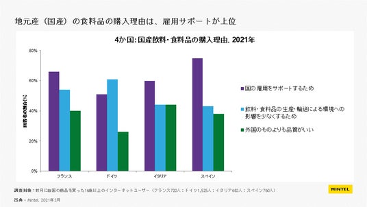 ヨーロッパ4か国での消費者調査で、国産の飲料・食品の購入理由を聞いた質問では、「国の雇用をサポートする」が4か国すべてで50%を超え、フランス・イタリア・スペインでは、1位となっています。