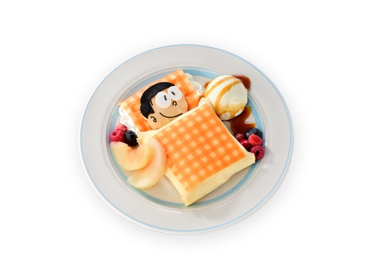 ぐっすり眠るのび太をイメージしたデザートメニューと、デザインが選べるラテに新たにのび太のアートが期間限定で登場