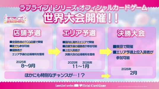 2025年8月~9月に全国のカードゲームショップにて店舗予選、2025年11月~2026年1月にかけて国内8ヶ所と海外3ヶ所でエリア予選、2026年2月に東京で決勝大会を開催いたします。