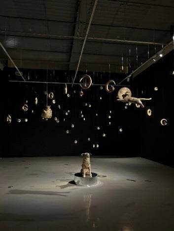 ここでは、片道分の燃料だけで宇宙に旅立った実在の犬、クドリャフカの物語をもとにした作品が展示されていました。