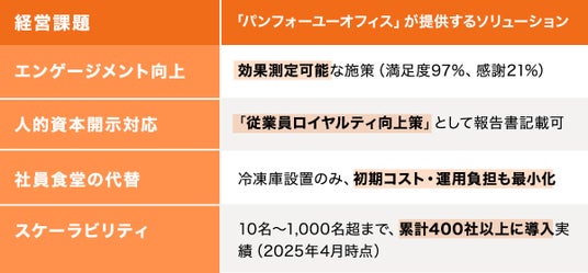 社員の声に耳を傾け、働く環境の充実に取り組む企業にとって、「パンフォーユーオフィス」は導入のハードルが低く、かつ従業員に実感されやすい福利厚生の一つとして、今後ますます注目されるサービスです。