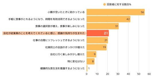 日常的な“ちょっとした気遣い”が職場にポジティブな空気を生み出します。アンケートでは、約2割の従業員が「会社への感謝が生まれた」と回答しており、福利厚生が感情面にも好影響を与えていることがわかりました。