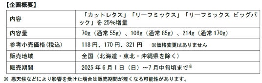 当社は今春、天候不良による契約産地の大幅な原料野菜の不作を受け、約4か月間にわたり一部商品の内容量を減らして販売することで、欠品防止に努めてまいりました。現在、レタス類の契約産地では好天に恵まれ豊作が続いていることから、3商品の25%増量企画を実施いたします。