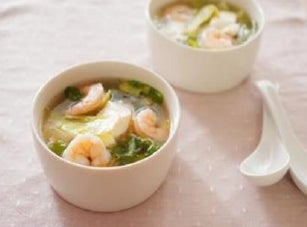 1.鍋に水を入れて、沸騰したらむきえび、絹ごし豆腐をスプーンですくって入れ、アクを取りながら弱火で煮る。