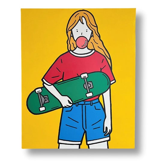 そのほか2024年の東京のアートフェアや個展などで展示した過去作も展示。少しセンチメンタルな色褪せない少年時代をテーマに、背景の黄色をベースに、少年少女を主体に漫画の様なタッチで描かれた作品です。