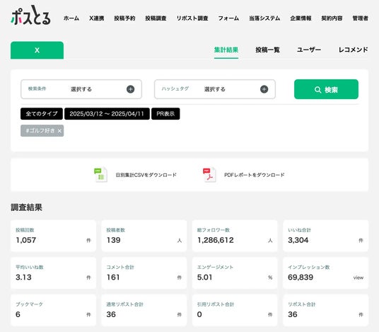 「ポスとる」は、X(旧Twitter)における投稿ごとのインプレッション数・エンゲージメント指標を自動で集計し、CSV出力による二次分析を可能にするツールです。