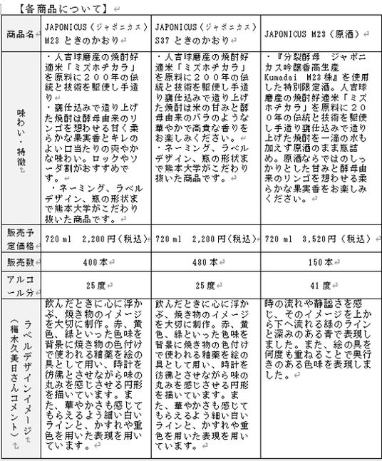 今回は、前回醸造に使用した株とは異なる分裂酵母Kumadai株JAPONICUS M23を用いた吟醸香本格米焼酎ときのかおりとその原酒版及び再度JAPONICUS S37を用いて醸造・蒸留したJAPONICUS S37ときのかおりを発売します。人吉市にあり、文政六年(1823年)創業と長い歴史がある深野酒造株式会社、熊本県産業技術センターと本学との産官学連携により生まれた本格米焼酎です。さらに今回は味わいが異なるものを3種類、数量限定で発売開始します。熊本大学生活協同組合をはじめ、鶴屋百貨店やゆめマート、熊本空港、熊本駅、観光施設等、多くの方々にお買い求めいただける場所での販売を予定していますので、取材いただくとともに、広く一般の方へお知らせくださいますようお願いいたします。