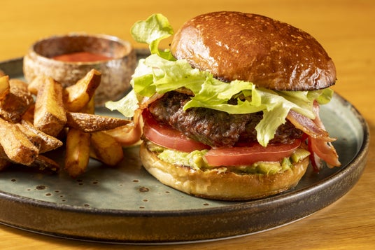 ■特 徴:カリカリのベーコンがのっている贅沢な和牛ビーフバーガー。コウサのシグネチャーであるカシューナッツソースなどを使ったスペシャルソースで提供。