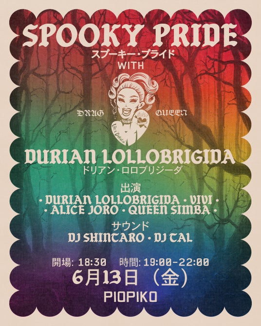 エースホテル京都2階に位置するバー&タコスラウンジ「ピオピコ」が一夜限りのスプーキーでグラマラスなパーティ空間に変身。メインステージには、唯一無二の存在感を放つドラァグクイーン、ドリアン・ロロブリジーダが登場。圧倒的なパフォーマンスを披露します。さらに、ViVi、アリス・ジョロー、クイーン・シンバといった実力派クイーンたちも出演し、音楽はDJ SHINTAROとDJ TALが担当し、身体が自然に動き出すようなグルーヴをお届けします。
