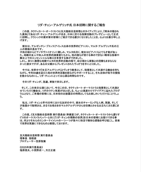 【緊急来日!】世界的ピアニスト、マルタ・アルゲリッチの長女、リダ・チェン・アルゲリッチが指揮者として出演!