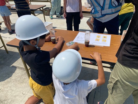 令和6年能登半島地震において大きな被害の要因となった液状化についての実験を実施。砂と水を入れたペットボトル内にカラフルなマップピンを配置し、振動を加えることで地盤の液状化を再現しました。振動により、砂中に埋設したマップピンが地表面に浮上する様子を通じて、地震時の液状化現象をわかりやすく説明。児童たちは、目の前で起こる現象に驚きの声を上げながら、熱心に観察していました。実験後、「家でもやってみたい」という声が多く寄せられ、防災教育としても有意義な時間となりました。