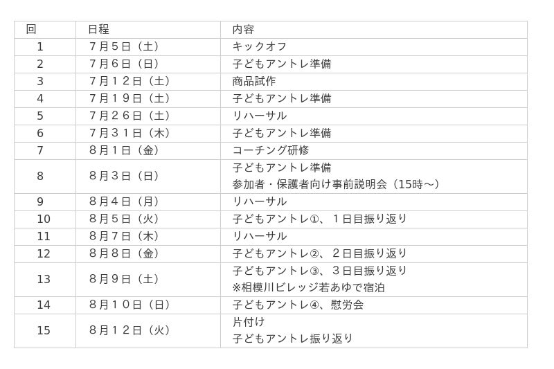 ※準備10日、子どもアントレ運営4日(内1泊2日で宿泊あり)、片付け・振り返り1日