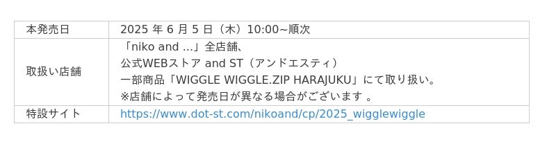 株式会社アダストリア(本部:東京都渋谷区渋谷 2-21-1、代表取締役社長:木村 治)が展開するスタイルエディトリアルブランド「niko and ...(ニコアンド)」は、韓国発の人気ライフスタイルブランド 「wiggle wiggle」とのコラボレーションアイテムを 2025 年6月 5 日(木)より「niko and ...」の全店舗、 公式WEBストア and ST(アンドエスティ)、一部商品を「WIGGLE WIGGLE.ZIP HARAJUKU」で発売します。