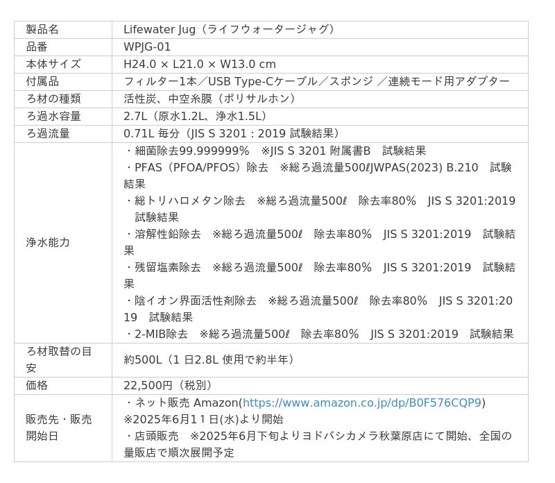 ウォーターポイント株式会社(本社:広島県広島市、代表取締役社長:小早川 克史、以下「当社」)は、日常でも災害時でも活用できるフェーズフリー浄水器「Lifewater Jug(ライフウォータージャグ)」を、2025年6月11日(水)よりネット販売を開始いたします。また、店頭販売は6月下旬よりヨドバシカメラ秋葉原店にて開始予定で、全国の家電量販店・ホームセンター・ショッピングモールなどで順次展開予定です。