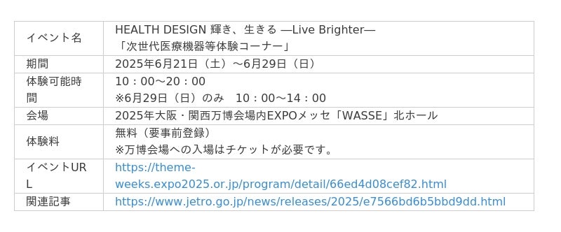 EXPO2025大阪・関西万博の「健康とウェルビーイングウィーク」に連動したイベント「HEALTH DESIGN 輝き、生きる ―Live Brighter―」において、テクノロジーを駆使した最新の医療機器や福祉機器の体験型展示イベント「次世代医療機器等体験コーナー」が設けられます。
