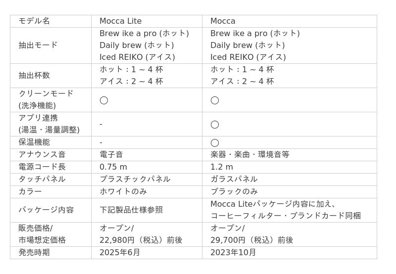 本体操作のみで美味しいコーヒーを叶えるシンプル設計な"Mocca Lite"(新製品)が登場することでコーヒーメーカーは2つのラインナップに。