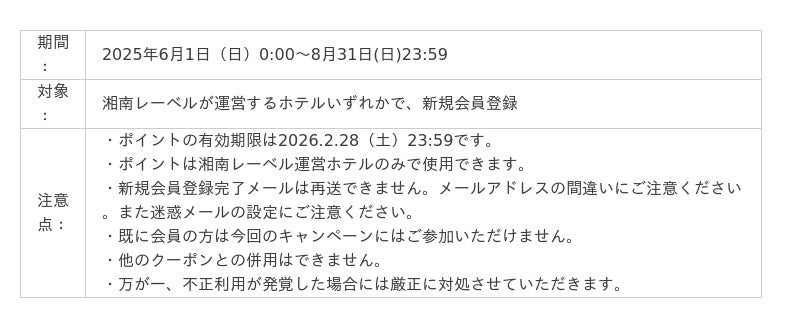 湘南レーベル株式会社では、2025年8月31日(日)までの期間限定で、湘南レーベル運営ホテルのいずれかにて新規でホテルメンバーへご登録いただいたお客様に、次回のご宿泊からすぐにご利用いただける1,000ポイントをプレゼントいたします。会員登録は、入会金・年会費は一切不要です。また泊まるたびに全ての姉妹ホテルで受けられる嬉しい特典もご用意しております。