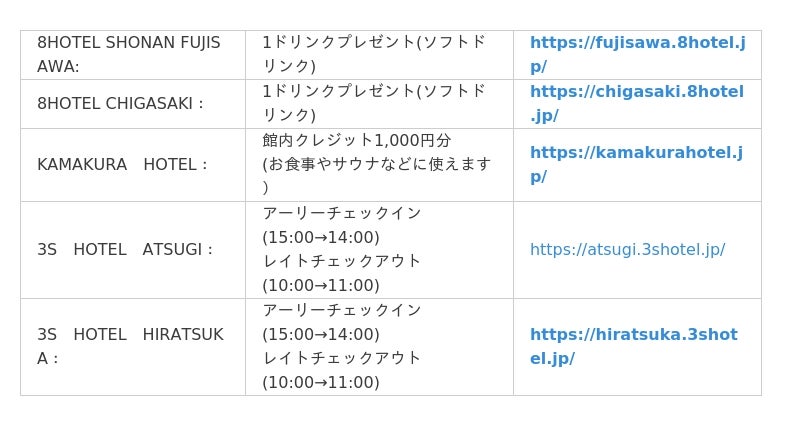 8HOTELやKAMAKURA HOTELなど湘南エリアの姉妹ホテルで、ご利用のたびに特典を受けられます
