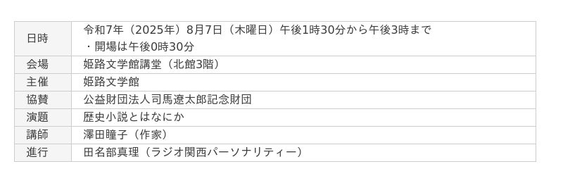 今回は、司馬文学に親しんでこられた澤田瞳子氏(作家)をお招きし、「歴史小説とはなにか」をテーマに講演をしていただきます。