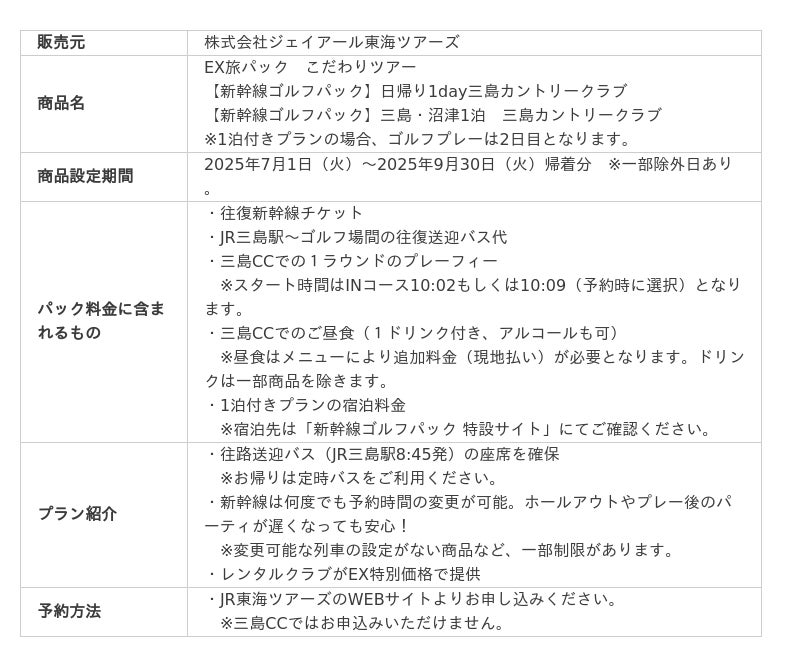 JR東海ツアーズがゴルフ付き新幹線パック商品第一弾として三島CCプレープランの販売開始