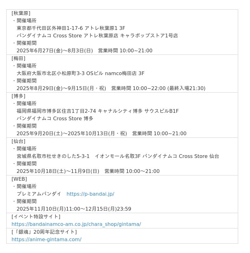 株式会社バンダイナムコエクスペリエンスは、「銀魂 キャラポップストア」を2025年6月27日(金)より、バンダイナムコ Cross Store アトレ秋葉原店で開催します。秋葉原での開催後は梅田、博多、仙台でも順次開催します。