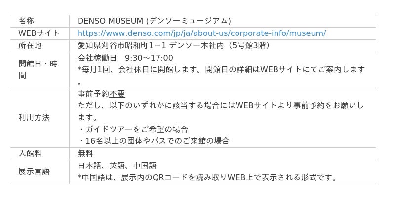 デンソーミュージアムWEBサイト:https://www.denso.com/jp/ja/about-us/corporate-info/museum/
