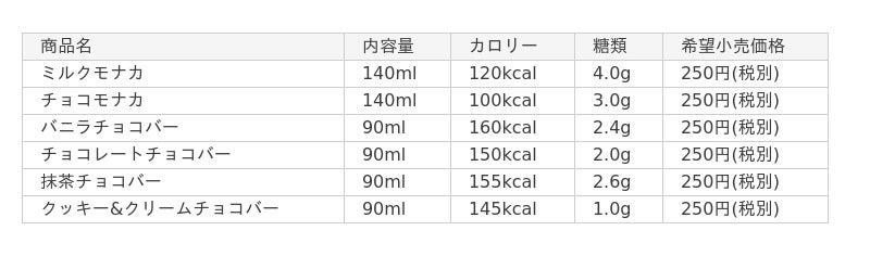 今回の日本初展開では、チョコバータイプとモナカタイプ全6種をラインナップ。